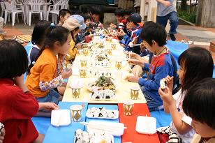 小学生・幼児・お母さん・ボランティアがテンプラと15升炊いたおにぎりで昼食会を楽しみました。 |