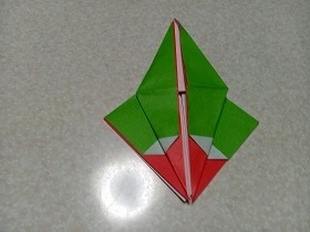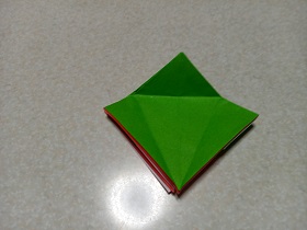 K一回開いてから上の三角を折っておきます。(花弁折りにする前に折れ線を付けておくと子ども達も簡単に折れます)