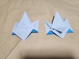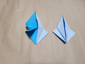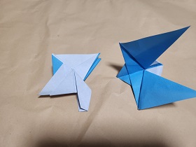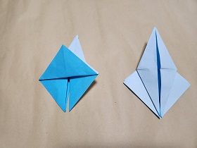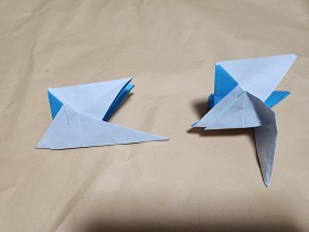 ツバメは羽根が大きく羽ばたくところに特徴があります。片面は鶴の基本折りから花弁折りにして、もう片面は三角に開いて裏側を出すやり方です。