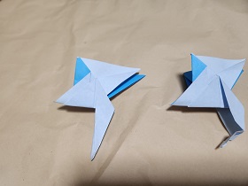 ツバメの完成した形です。上の写真の左の先端を持ち、下の部分を持ち引っ張ると右の写真のように羽根が開きます