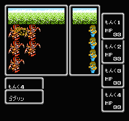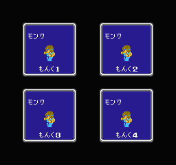 そんなわけで最初からモンクパーティでやってますが、アストスでいきなりつまってます。どうもファミコン版とダメージとクリティカルの算出方法が違うらしく、通常攻撃では1〜2ダメージしか当らず、全然勝てません。 当分はレベル上げに専念かな・・・