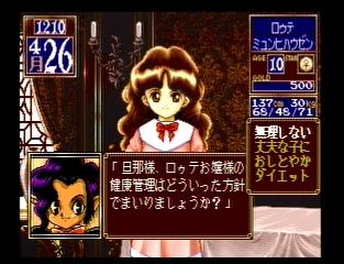 「悠久」殿による紹介です。(一ヶ月以上前) 育成シミュレーションゲーム。 前作と同じく、娘を18歳まで育てるゲーム。 コマンドもイベントも武者修業のMAPも前作と比べて大幅に増え、自由度が増している。 前作と違い18歳になった時点でゲームは終わり。 自分(悠久)が育成モノをプレイすると、力や体力が必ずずば抜けてしまうのは、過去にRPGばかりやっていた後遺症であろう・・・ |