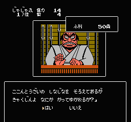 「悠久」殿による紹介です。(一ヶ月以上前) RPG。 前作まではアクションだったじゃじゃ丸君だが、今回はRPG。姿まで別人になっている。 3つのシナリオのうちから1つを選んで進めることができる。全部のシナリオをクリアすると、隠しシナリオも楽しめる。 各シナリオをクリアする毎にレベルが1に戻ってしまうのは残念。 途中からさくら姫が仲間になり、戦力がアップする。 |