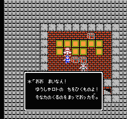 そもそもこの勇者は武器も防具も何も持たずどこからどうやってラダトームの城に来たのだろう?ラダトームの町に実は住んでいたのか,だとしたら家が登場していても不思議ではない。あと考えられるのはラダトーム兵が厳重に警護して連れてきたのか,あるいは王様が怪しい呪術でも行って召喚したとか・・・・?