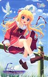 ■May.10.2006 今日は電撃姫通販のテレカが到着。GWの影響か今月は到着が遅めでした。今回申し込んであったのは「めがちゅ」と「青空の見える丘」の2枚。「めがちゅ」はこれが初テレカですね。 「めがちゅ」は個人的にはキャラインパクトは弱めですが、雑誌情報にはサブキャラについんてーるキャラが居たりしたので微妙に期待(笑)テレカに関しては「ジブリール」シリーズよりも触手とか虫とかの気色悪い絵柄が無さそうな分、気持ち的には集めやすそうではあります(^^; 「青空の見える丘」はショップ特典は発売日直後からはチェックもしてないので未コンプのまま。ですがとりあえず当初予定していた分までは入手してるので一応満足レベル。 今日のテレカは届いたばかりの「めがちゅ」のテレカです。電撃姫通販のゲームタイトルのテレカは見開きイラストを使うので横柄の方が多いですね。 |