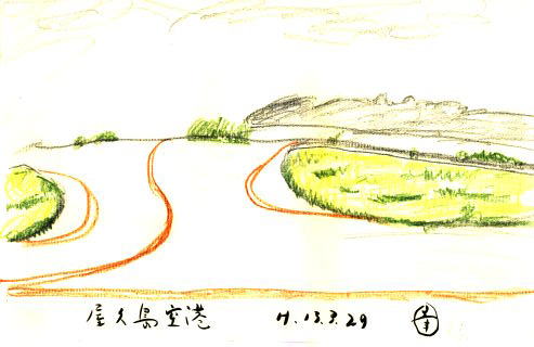 美しい屋久島空港 私は飛行場に行きますと、どうしても絵を描きたくなるのです。 何の変哲もないような飛行場ですが、何かなつかしく、さわやかに、心が落ち着き、胸ふくらみ、頬がほころび、恋人に逢ったような、夢みるような、希望が湧いて来、はればれとした気分になるのです。 不思議ですね。然もその飛行場は田舎の飛行場ほど良いのです。 何もない滑走路だけの飛行場、それがよいのです。孤島の飛行場ですね。 嗚呼、屋久島空港はなんと素敵な飛行場でしょう!!