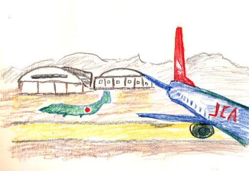 名古屋空港ロビ−で搭乗時間待ちの間、夕方の空港の姿は美しいものでした。滑走路の向こうには格納庫があり、その前には自衛隊の飛行機が一機とまっていました。