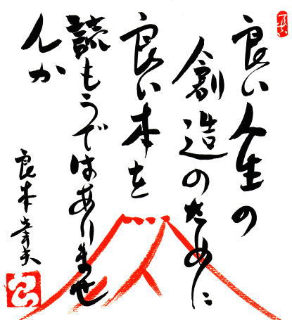 先日、名古屋市内の地下鉄に乗っていましたら、鶴舞駅でおばあさんが乗り込んで来ました。すると茶髪の若い男子青年が、すっと立ってにっこり笑顔で「おばあちゃんどうぞ」と言って席を譲りました。おばあちゃんは「どうもありがとう」と言って座りました。この光景はまことに美しいコトバの表現でありました。身(座席を立つ)・口(言葉で呼びかける)・意(親切な心)。この世界は正に言葉によって成り立っていますね。良い言葉を盛った良い本を読み、良い言葉を使いましょう。