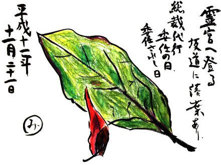 平成11年11月21日は、谷口清超先生から谷口雅宣先生へ、生長の家総裁の代行を委任なされた日でありました。その日、龍宮住吉霊宮に参拝のため、山道を歩いていましたら、木の葉がたくさん落ちていました。それを一枚だけ拾って持ち帰り、絵にしてみたのがこれです。その日は天地自然、何を見ても有り難く尊いものに見えました。今思えば不思議なことでした。