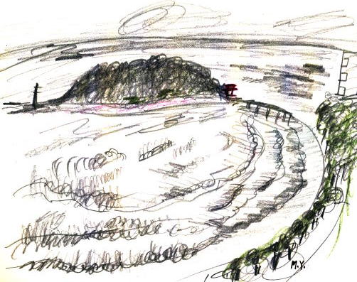 お参りを終えて帰途につきました。相変わらずの風雨・風波の橋の上、再び體を水平に近くして橋の欄干につかまりながら神の島を離れ、橋を渡り終え、石垣の陰にてカバンの中からスケッチブックと絵の具を取り出し、砂浜と海と島を描いてみました。雨のしぶきで画用紙が濡れました。