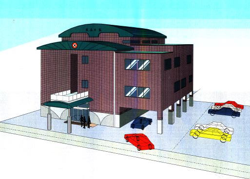 下の図面は増築完了後の「イメージバース」です。左の丸屋根の部分が現在のものです。右の方の平屋根の部分が増築のものです。完成は来年平成16年3月末の予定です。平屋根は近い将来「太陽光発電」装置を設置するとの考えが含まれてのものです。