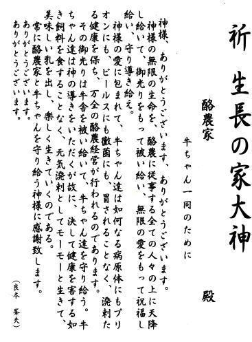 お気づきの方はどうぞこの「祈り」をなさって下さい。牛舎の壁に貼り付けてください。そして牛ちゃんの背中を撫でながらこの「祈り」をなさって下さい。神様の御護り厚からんことをひたすらお祈り致します。(平成15年12月24日夜記す)