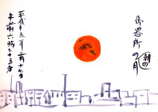 朝起き出でて見れば西の夜空にまん丸い月がかかっていて、静かにその姿を私に見せてくれているのでした。