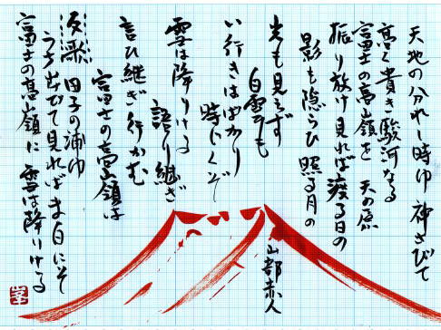 私は今日の妻の誕生日のお祝いの感動と、万葉歌の絵を観ての感動を忘れがたく、何か自分で表現したいと思って、有名な山部赤人の歌を赤富士の上に書いて自分の心を慰めている次第です。