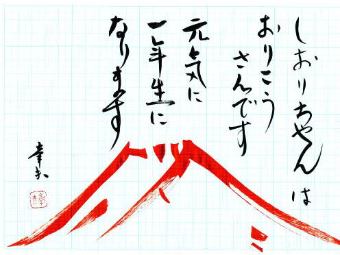 (しおり、8がつ14にちうまれ、3がつ28にちにかきました。2003ねん)