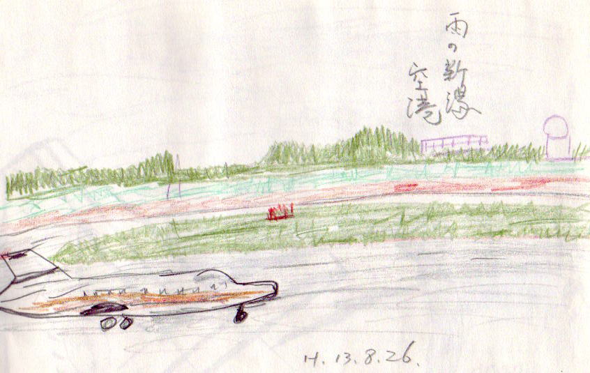 7月16日(飛行場 飛行機 青春のロマン 何故か知らぬが 僕は 大空を 飛びたくなる 下の2枚の絵は 2年前に 新潟と仙台に行ったとき 描いたものです)