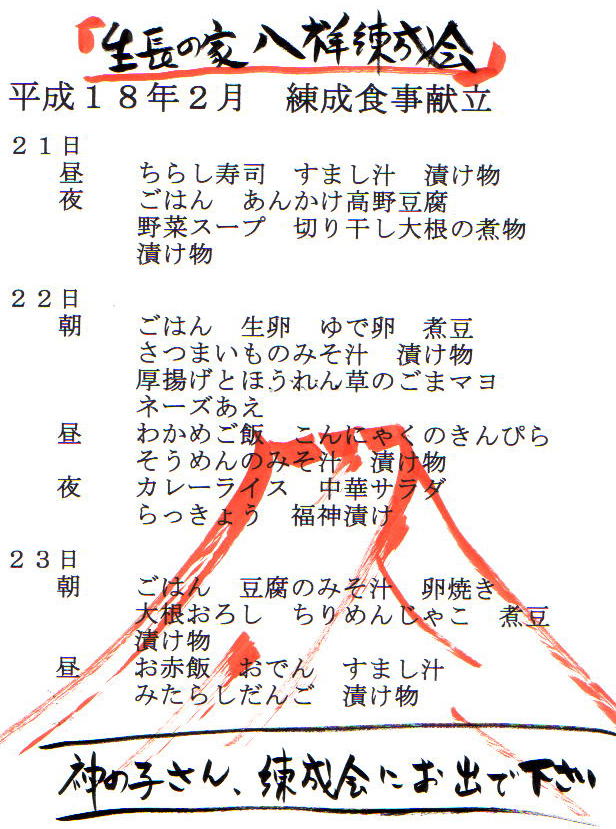 ここには 練成会の食事献立表を掲示致しますが このHPを御覧の皆様には どうぞ練成会にお出で下さい。お待ちしています。
