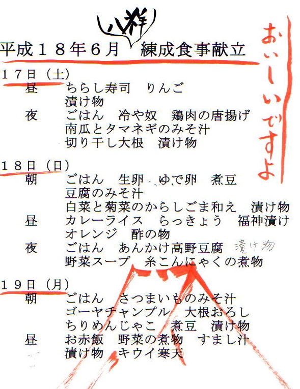 6月の生長の家兵庫教区の「八祥練成会」が17日から始まります。皆さん練成会にお出で下さい。 最初の日の17日は午前中に 谷口雅春大聖師21年祭が 厳粛に執り行われます。 その日の午後から八祥練成会です。今回も下記に練成会の献立表を載せました。楽しい練成会ですよ。 どうぞ皆さん にぎやかにお出で下さい。 皆さんの御参加をお待ちしています。 合掌再拝。