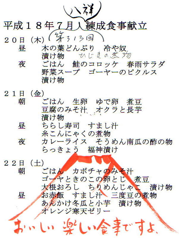 合掌 ありがとうございます。7月20日から第313回八祥練成会が始まります。楽しいすばらしい練成会ですよ。このHPを御覧の皆さんには 是非お誘い合わせ お出で下さい。ここには練成会の食事献立を載せます。この献立を御覧になりますと、おわかりいただけると思いますが、生長の家の練成会では、一切肉食は致しません。このことは生長の家の方針です。では皆さんのお出でをお待ちしています。合掌再拝