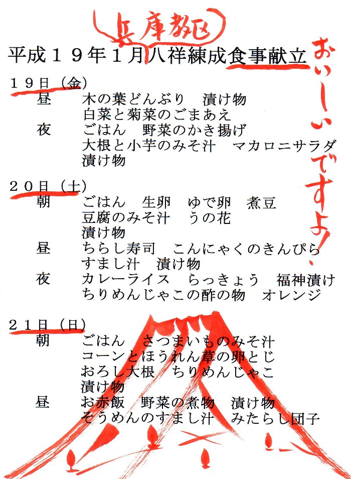 また食事献立も炊事担当の皆さんが 特別献立の“新年御馳走”を振る舞ってくださることになりました。下記にその美味しい献立表を表示致します。