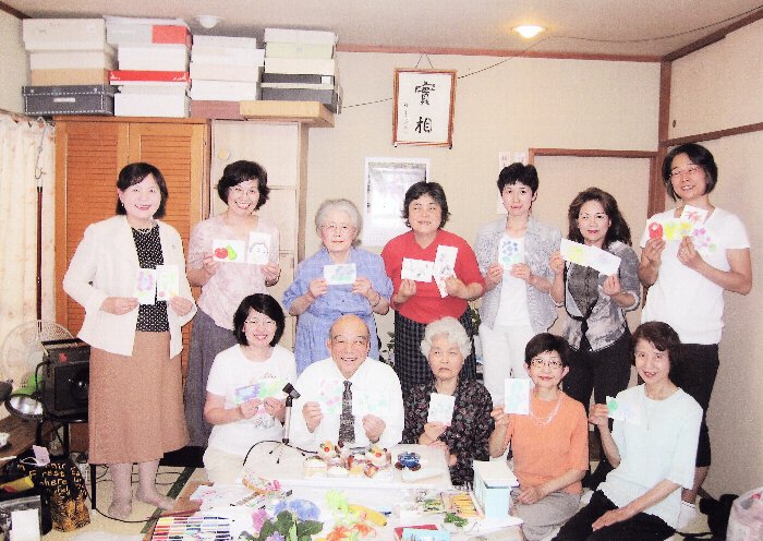 下の記念写真を観て下さい。皆さんが自分で描いた絵はがきを持っていますね。テーブルの上には「花」「お菓子」「絵の具」が並んでいますね。皆さんのにこやかな笑顔が美しいですね。嗚呼、生長の家白鳩会は素晴らしいですね。ありがとうございます。ありがとうございます。