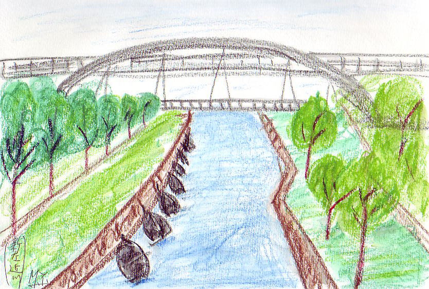 今日は久しぶりの木曜休日です。東京も梅雨に入って、ぱらぱらと、小雨が降ったり止んだりでしたが、今日は何となく自転車散歩に出かけました。いつも見渡す「新左近川」、この美しい流れは何にたとえましょうか。私はこの場所で(橋の上)、この景色をスケッチするのは何度目でしょうか。いつ来ても、この川の流れは私の目の心の慰めとなります。