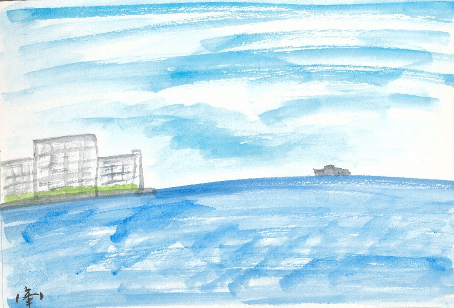 「神想観」でも「神の無限の智慧の海・愛の海・生命の海ーーーー」ですね。「海」は素晴らしいですね。海の絵を描いていますと自分の心が広々としてきます。絵筆を両手のひらに挟んでしばらく神想観です。「生きとし生けるものを生かし給へる御祖神ーーーー」 海辺で絵を描く時には遊びに来ている大人や子供達にのぞかれないように、恥ずかしいですから、気を付けて描いています。