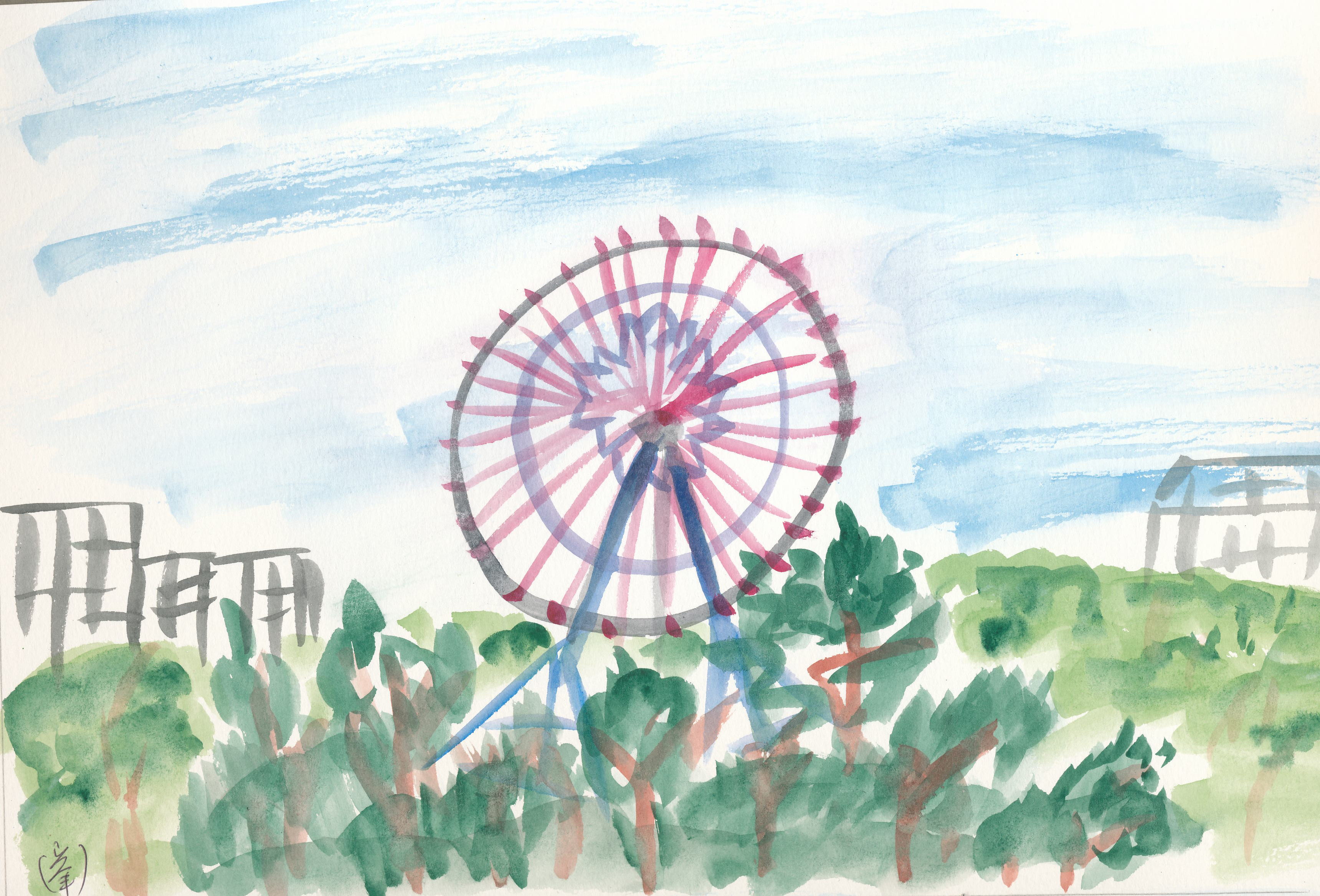 緑濃き松林のはるか向こうにある丸い大きな乗りもの、ゆっくりと廻っているようです。この絵には描いていませんが、松林の右手の方角は、広々とした大海原です。(私は何枚もこの海の景色を描いています)