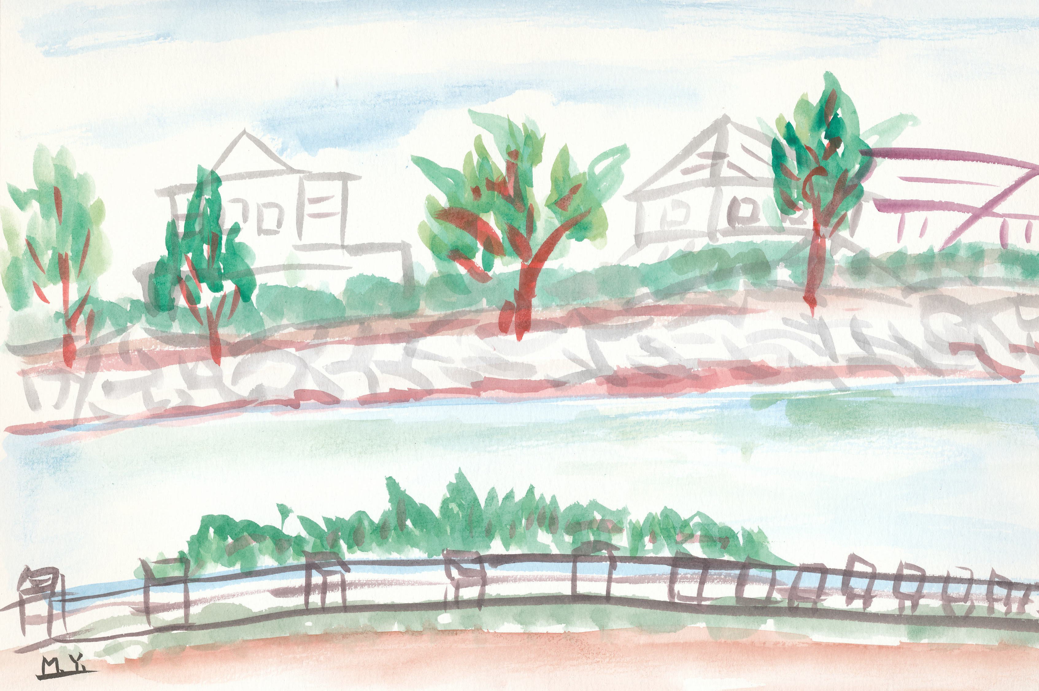 今日は木曜休日です。いつもなら自転車に乗って東京湾の海・島の風景をスケッチに出かけるのですが、今日は朝から雨が降っていますので自宅で読書です。(下の絵は今年の夏頃天気の良い日に描いたものです。)
