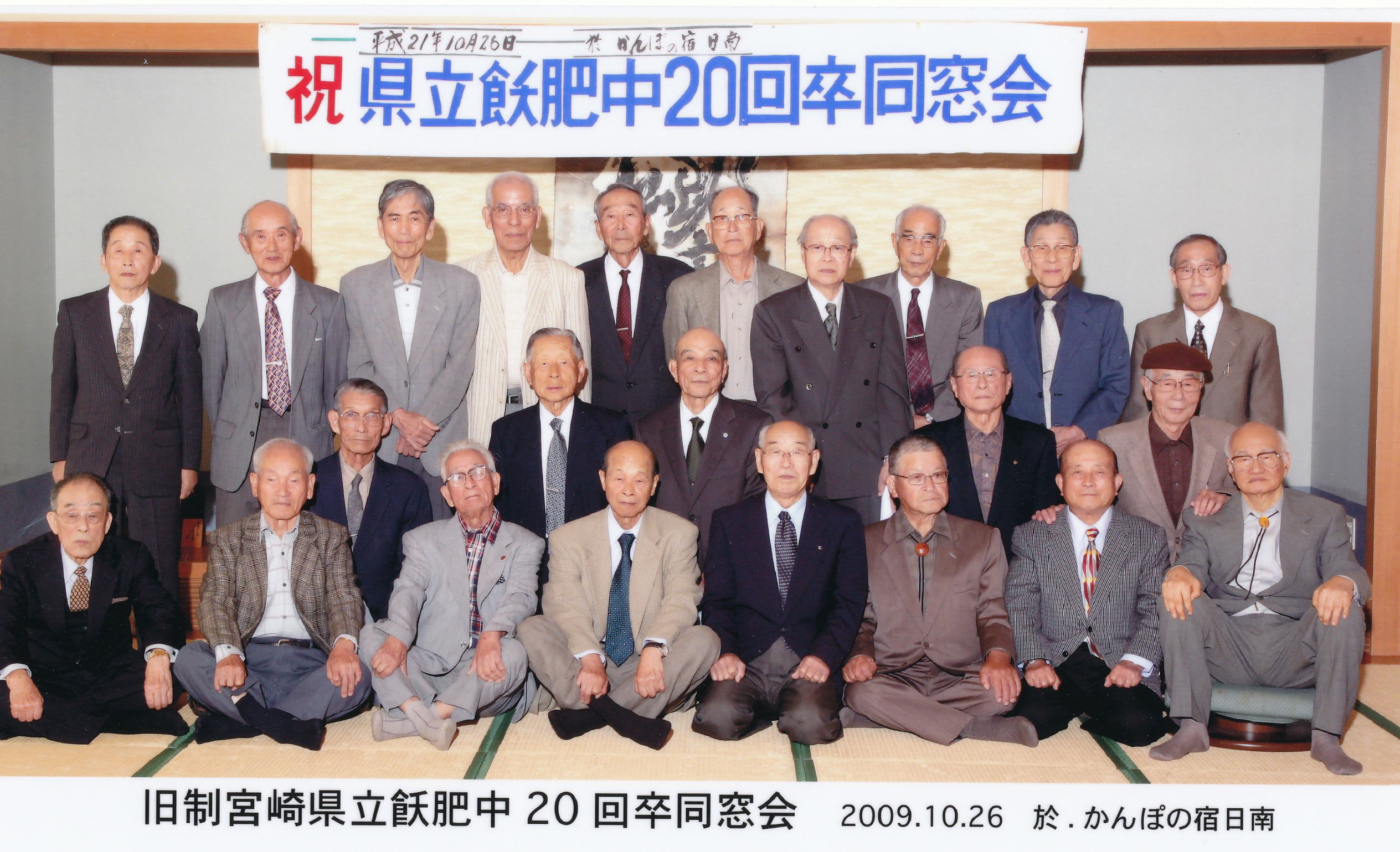 旧制飫肥中学20回卆同窓会の記念写真です。 合掌 ありがとうございます。 去る10月26日に開かれた「旧制飫肥中学20回卆同窓会」の記念写真が送られて来ましたので、なつかしく下に写真を掲げます。みんな若々しく元気です。(実は私良本峯夫は中学4年生の時に志願して予科練に入隊しましたので、飫肥中学は中途退学で、卒業はしていないのですが、然し同級生であることには間違いありませんです) 皆さんのお元気をお祈りします。合掌再拝。