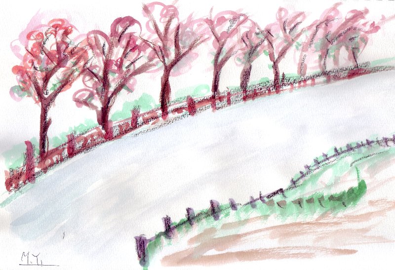 下の絵は自宅の近くを流れる川の桜満開の時の絵です。今は緑の葉を繁らせています。自宅のパソコンでUPしています。教化部の事務局長さんや、御本部の先輩の紀野さんに色々と御指導をいただいていますことを深く感謝御礼申し上げます。ありがとうございます。