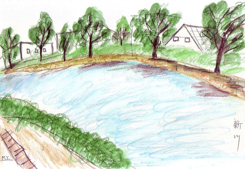 大江戸の 新川の流れ 美しく たたずむ我は 天国にあり 吹く風の さわやかにして 絵筆持つ 我れなごやかに 川と語らむ 木曜日 休日なれば 我行かん 川の流れの 誘いに乗りて