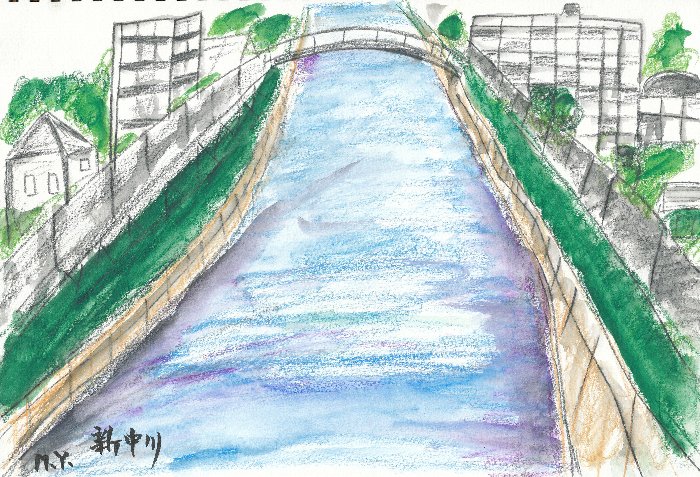 橋の上から「新中川」の流れを眺めて、人生の川の流れをしみじみと思います。この絵を橋の上から描いていましたら、お年寄りの夫婦が通りかかって、そのお年寄り男性が「嗚呼私と同じことをやっていらっしゃいますね。私もついこの前まで此処であなたと同じ絵を描いていましたよ」と言ってしみじみ僕の絵を眺めていました。