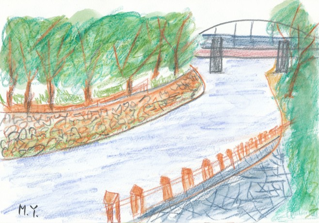 本日木曜休日、自転車で病院眼科に行きました。僕の眼はよく見えます。帰りに川の流れの絵を描きました。色鉛筆で描いて、後で水筆でなぞったのですが、こういう絵の描き方で良いのかしら?