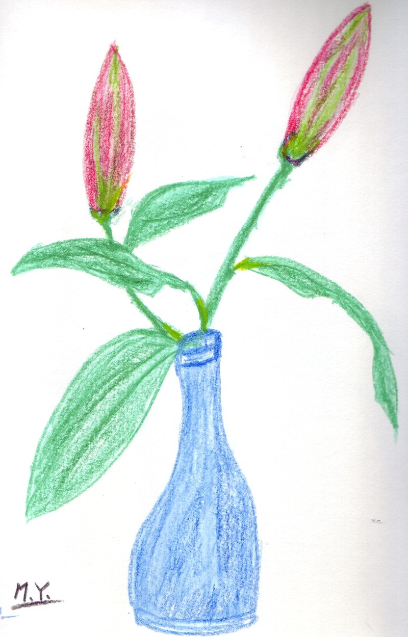 事務所の前の待合室に、可憐な百合の花の「つぼみ」が”ぽつん”とたたずんでいましたので、つい見とれつられて絵にしました。クレヨンで描きました。目の前の花を見ますとスケッチしたくなるのです。長年の習慣ですかね。上手などとは思いませんですね。