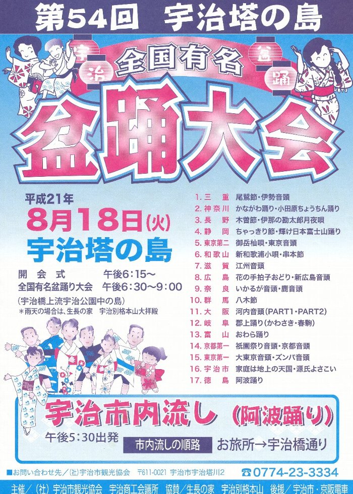 18日の夜は恒例の、宇治塔の島「全国有名盆踊り大会」でありました。全国17の地域の代表の皆さんによる盆踊りです。塔の島は大賑わいでした。下に掲げたのはその時もらった盆踊り大会のチラシです。