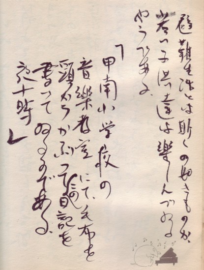 リュックと毛布をかついで、先ず住吉中学に行ったが、ここでは中へ入れてもらへなかった。阪急電車の線路から上の方は電気もついてゐるが、下の方は電気がつかないのである。それでまた ぞろぞろと歩いて南に下り、甲南小学校に避難した。最初は玄関にねてゐたのであるが、電気がついたら玄関の自動ドアが開いたり閉まったりするので、校舎の二階・音楽室に行った。ここは玄関より暖い。既に二・三十名の人が避難してゐた。
