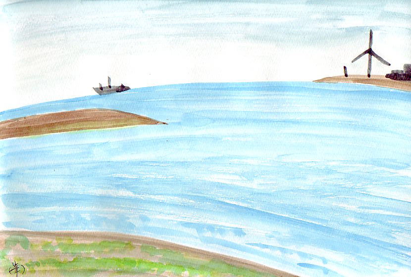 青い海と空を眺めていますとどうしても絵に描きたくなるのですね。永遠の彼方の神の国が今、目の前に見えてくるような感じがするのですね。航行する船には何処に行くのか、天国へ行くのか、僕も連れて行ってくれと声をかけたくなりますね。 嗚呼永遠の天国が今、目の前に此処にあるの感じですね。よく晴れた日の午後の海岸散歩の感じでした。