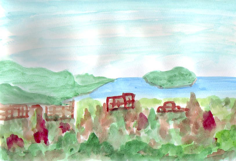 長崎のホテルの窓から大村湾を眺めて、絵の具の色が赤ばかりとなってしまいましたね。紅葉の木々を描いているうちに建物の色まで赤になってしまいました。この赤いのは建物なのですよ。青い海に浮かぶような青い色の小さな島もあり。空の青さは美しかったです。