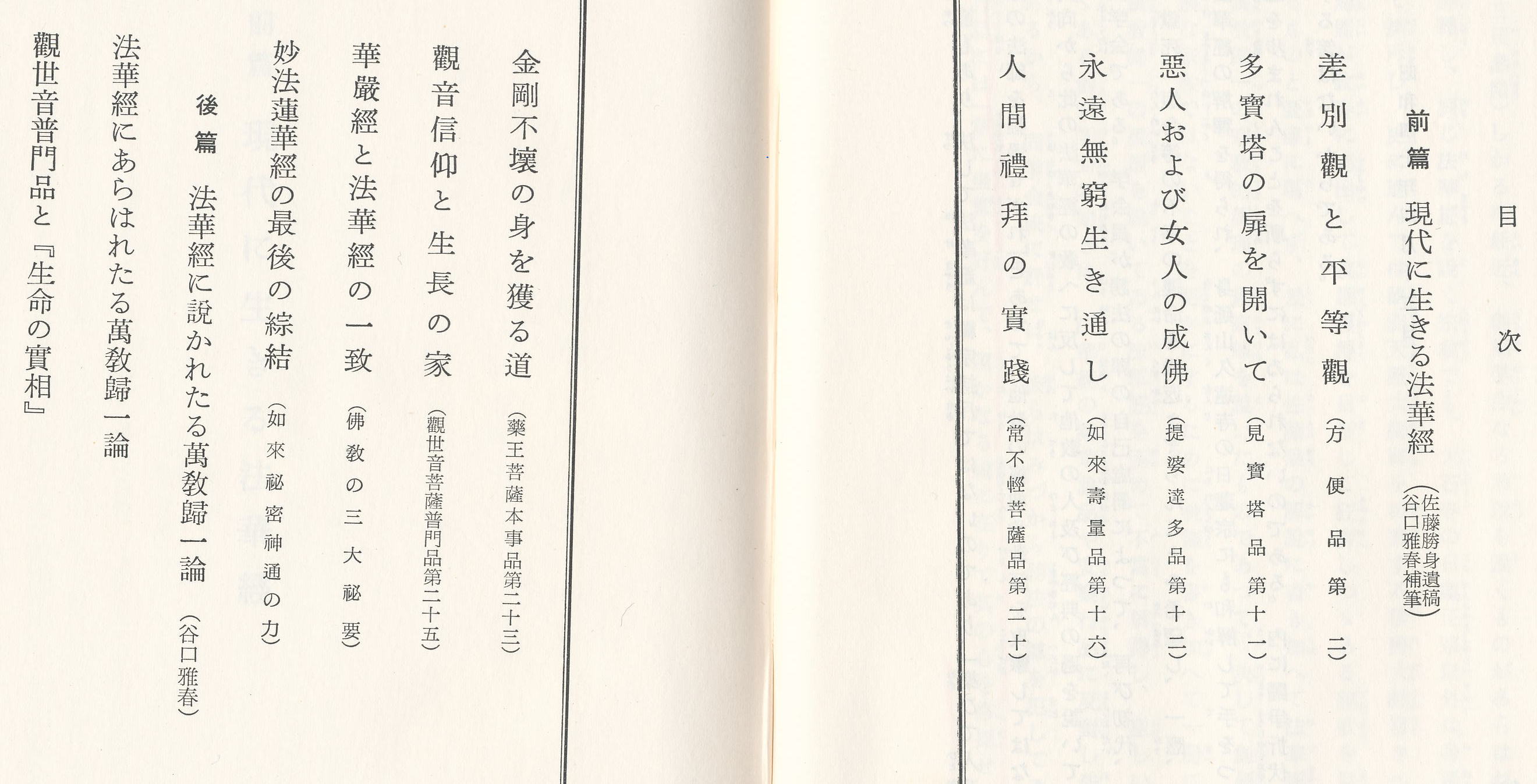 「大体、生長の家の教へは一宗一派の宗教ではなく、すべての人間が一つの大生命を本源として生まれて来たものであるから、その本源を一つにするすべての人間の魂が救はれる宗教的眞理も一つでなければならないと云ふ見地に立つ萬教共通の眞理を説いて来たのである。ーーーーー佐藤勝身翁も方便品にある「諸佛は語異ることなし」といふ聖句を解釋して「眞理は唯一つであると云ふことであります」と書いてをられる。ーーーー」