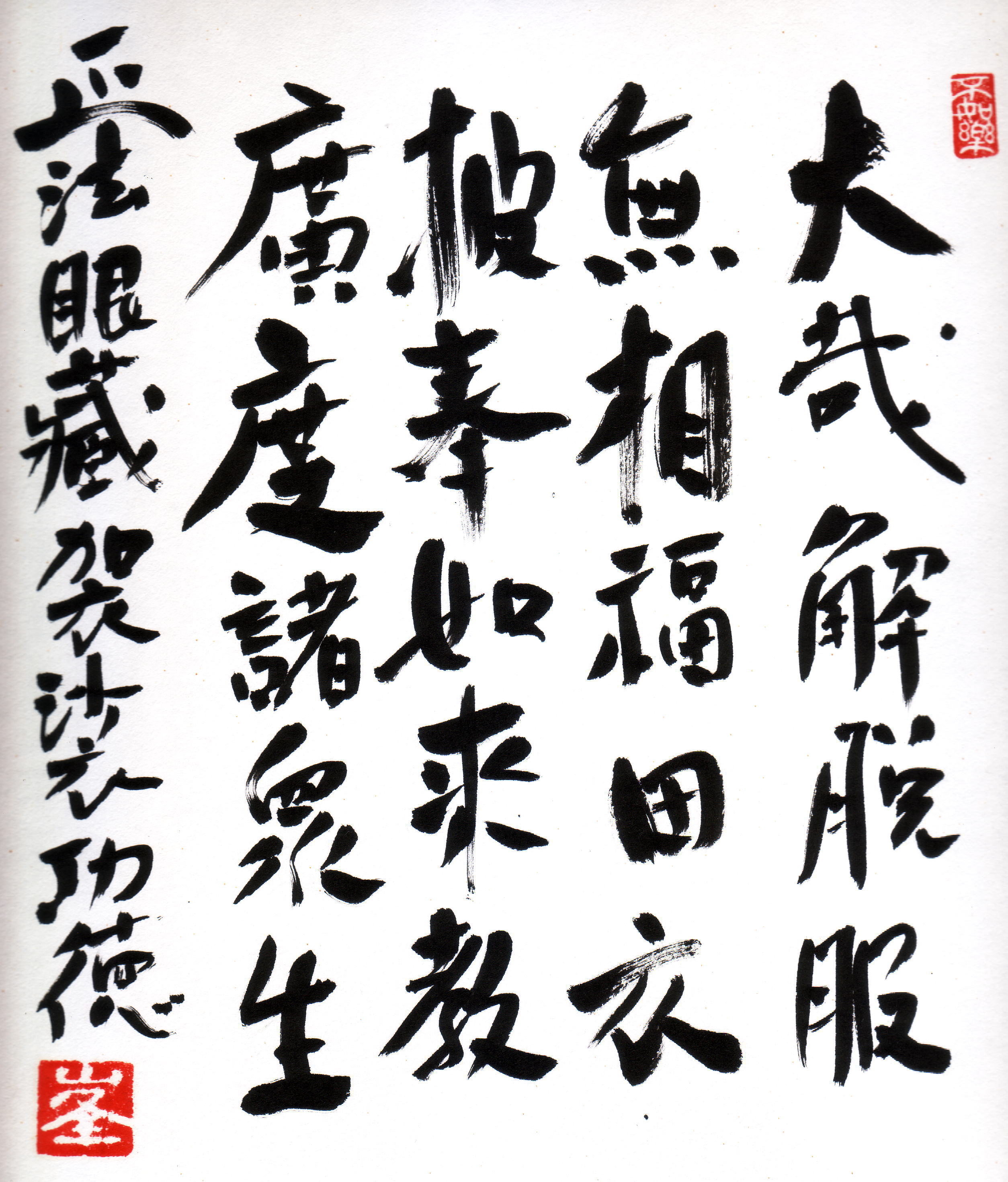 「大哉解脱服、無相福田衣、披奉如来教、廣度諸衆生。」(大なるかな、げだつ服、無相の福田衣、如来の教えをこうむり奉りて、広くもろもろの衆生を度せん)