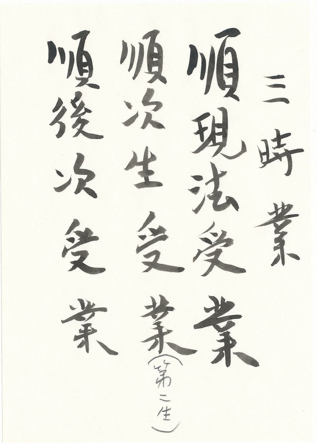 「一者順現法受。二者順次生受。三者順後次受。」これを三時といふ。佛祖の道を修得するには、その最初より、この三時の業報の理をならひあきらむるなり。しかあらざれば、おほくあやまりて邪見に堕するなり。ただ邪見に堕するのみにあらず、(略)ーーーこの三時の業、善悪にわたるなり。」
