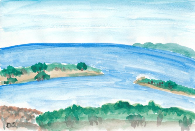 いつ来ても美しい海と空、心晴れ晴れです。大自然は神様によってこんなに美しく造られ、表現されたのですね。この景色を眺めていますと、其処に神様が居らして、にこにこと微笑みかけていられるような感じがしますね。私は神様が大好きです。自然が大好きです。休日になりますとどうしてもこの景色を眺めに海辺に行きたくなるのです。絵の具と画帳を持って、自転車に乗って。