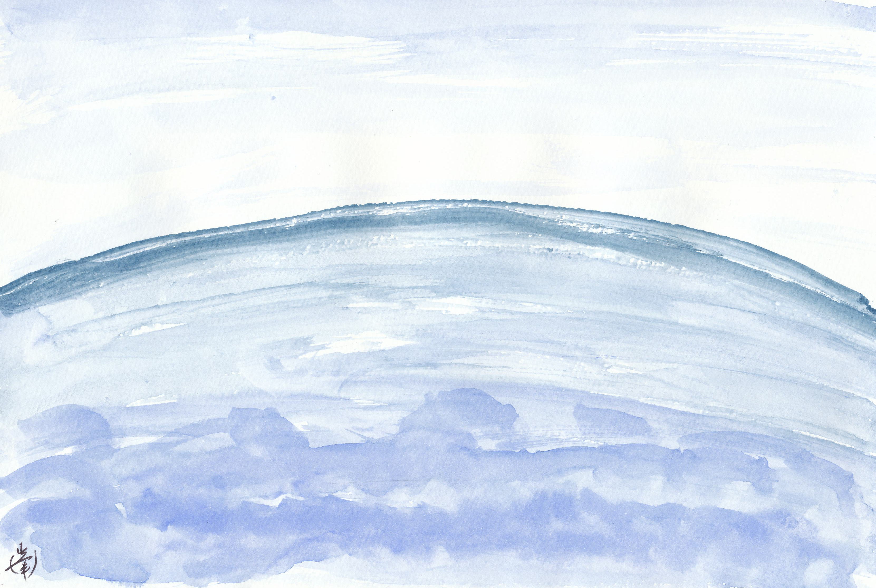 海の蒼さに、広さに、美しさに見とれて、こんな絵を描くに至りました。地球が丸いということを感じますね。何だか自分の心の思いを描いているような気がしてなりませんです。「汝丸くあれ、美しくあれ、何も持つな、広々と生きて行け!」と。