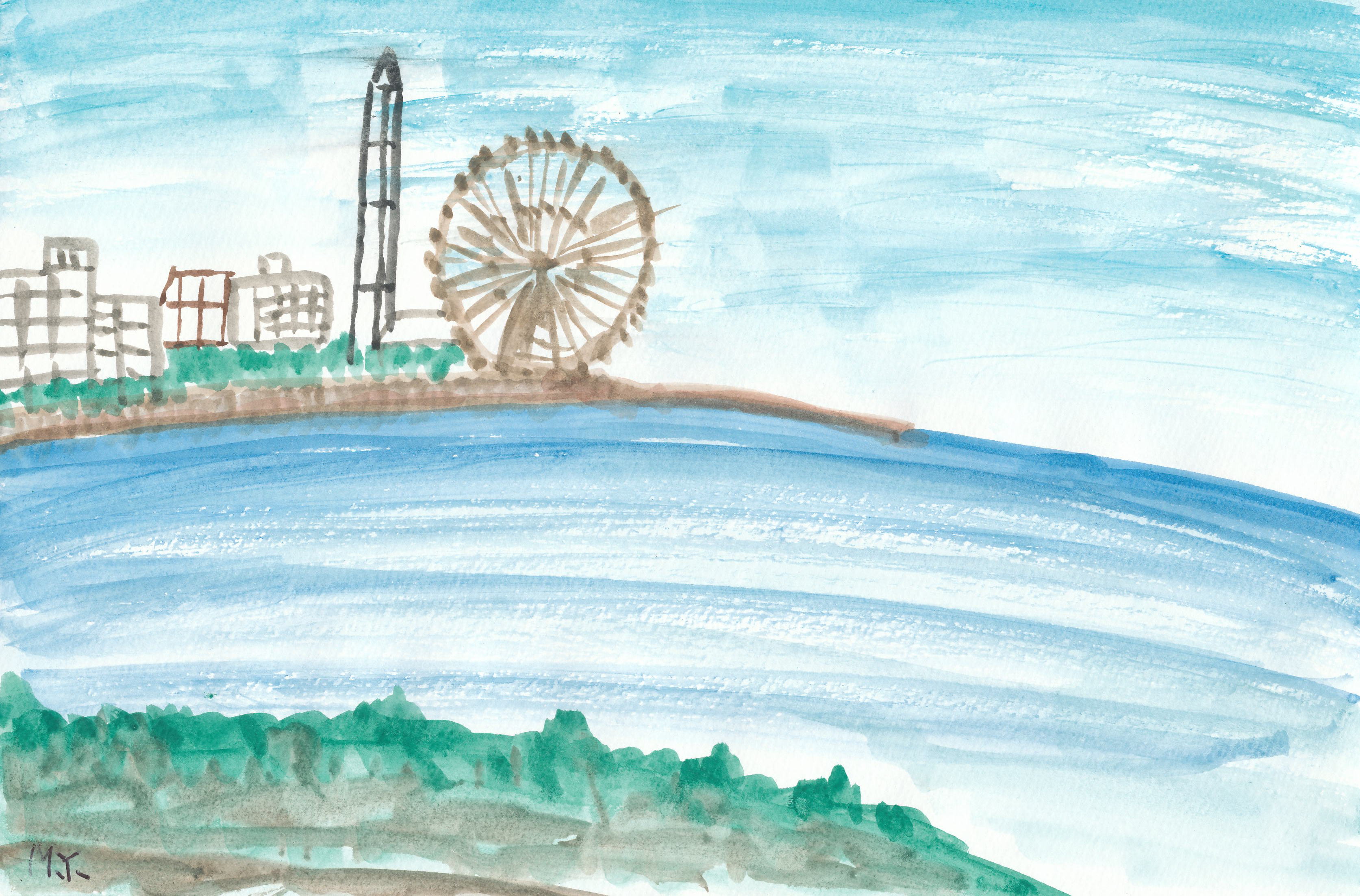 青い空と海、そして地上の建物を見つめていますと、自分も海で泳ぎたくなり、またあの青空を飛びたくなるのですね。飛行機の操縦ですね。65年前の特攻青年の面影が蘇ってくるのですね。然しよく考えてみますと、目の前に広がるこの海と空の風景は平和そのものですね。限りなく美しく楽しい海と空ですね。希望に胸のふくらむ想いがしますね。嗚呼青年よ夢を描けですね。世界の平和が其処にあるのですね。実相円満完全・実相円満完全!!