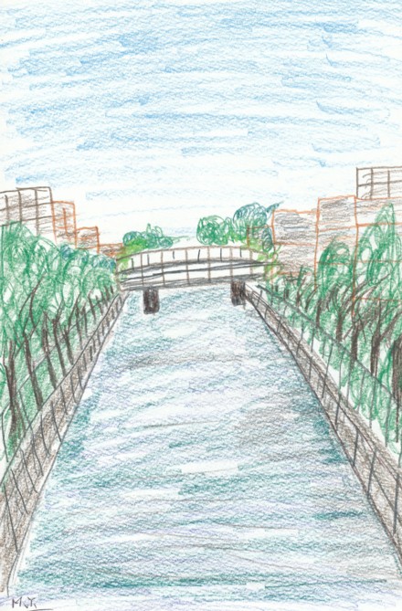 この川の名が「新川」であるということを初めて知りました。実はこの川の絵を描いている時、可愛い犬を連れて散歩している中年の男の人が、僕の絵をじーっと観ているではないですか。僕は恥ずかしくなったので、絵筆を擱いて、その男性に話しかけたのです。そして聞きました。「この川は何という川ですか」と。そしたらその男性は直ぐに“「新川」ですよ”と答えて下さいました。ああ此の川は「新川」という名かと、僕はほっとしました。実は今までこの川の美しさに見とれて何枚も絵を描いているのですが、川の名前がわからなかったのです。僕の住んでいる近くには大きな川が3つあるのです。その二つは「中川(川幅約200メーター)」と「新中川(川幅約150メーター)」です。そして今日知った「新川」の川幅は約50メーターです。僕は休みになるとどうしてもこの3つの川を見に行きたくなるのです。絵を描きにです。