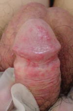 亀頭包皮炎(きとうほうひえん)は、セックスやフェラチオ、オナニーなどの際に、亀頭や包皮に小さな傷ができ、そこから雑菌や真菌(かび)が感染しておこります。病気になるのは自分だけで、性行為感染症(性病)ではありません。症状は、亀頭や包皮の発赤・ただれ、軽い痛み(またはかゆみ)で、この写真以外にも様々な症状(かさかさしたり、逆に湿ったり、恥垢が大量にでたりします)を示します。治療は、抗生物質や抗真菌剤の軟膏・クリームを塗布し、局所の清潔を心がけます。その他、アレルギーで起こる亀頭包皮炎があり、この場合はステロイドの軟膏・クリームを使います。三種類の薬(軟膏・クリーム)をオンライン処方(郵送)出来ます。料金は、3,000円です。