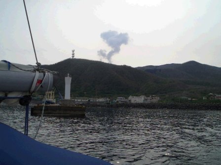 23マイル先の火山の噴煙が立ち昇る、三宅島の阿古漁港に10時半入港。
