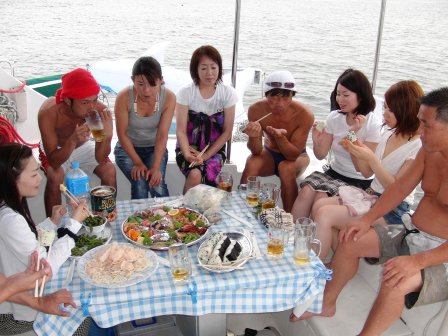 散々海で遊んだら、シャワーを浴び、セーリングしながら又、呑むぞっ!喰うぞっ!結局 生ビール15g空にしました。