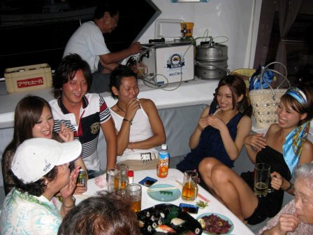 18時出航と同時に、生ビールで乾杯っ!M君は就職も内定し、卒業まで遊ぶ気充分か?